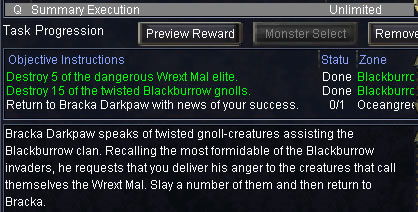 killできたらDarkpaw Campに戻り、Bracka Darkpawに /hail するとtask完了です。