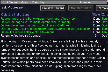 Villageへ戻り、Apothecary Cadmaelに /hail するとtask完了です。