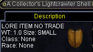 Dawnshroud PeaksのLightcrawlersっていうムカデからA Collector's Lightcrawler Shellをloot。