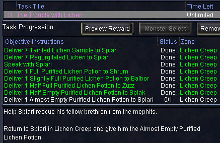 SplariにAlmost Empty Purified Lichen Potionを渡すとtask完了です。